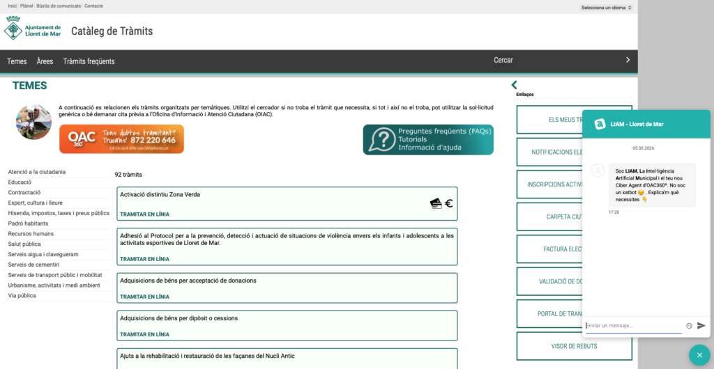 - El ciberagent LIAM®, accessible per WebChat o WhatsApp dins del servei OAC360º, que cobreix l’assistència a la tramitació 24 hores al dia, 365 dies l’any, amb IA generativa especialitzada.